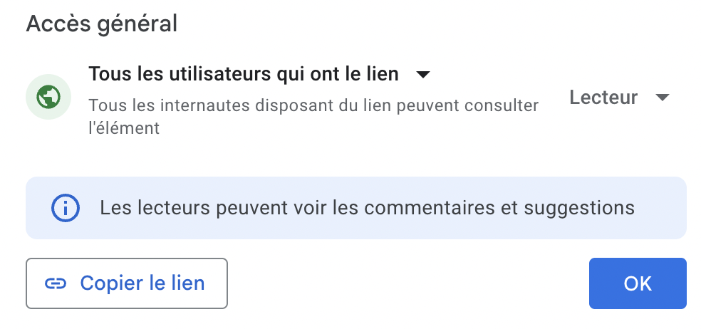 Attention : dans Google Drive, veillez bien à sélectionner un accès en "lecture" auprès de toutes les personnes qui disposent du lien (les options de partage sont accessibles en faisant un clic droit sur votre fichier) 👇